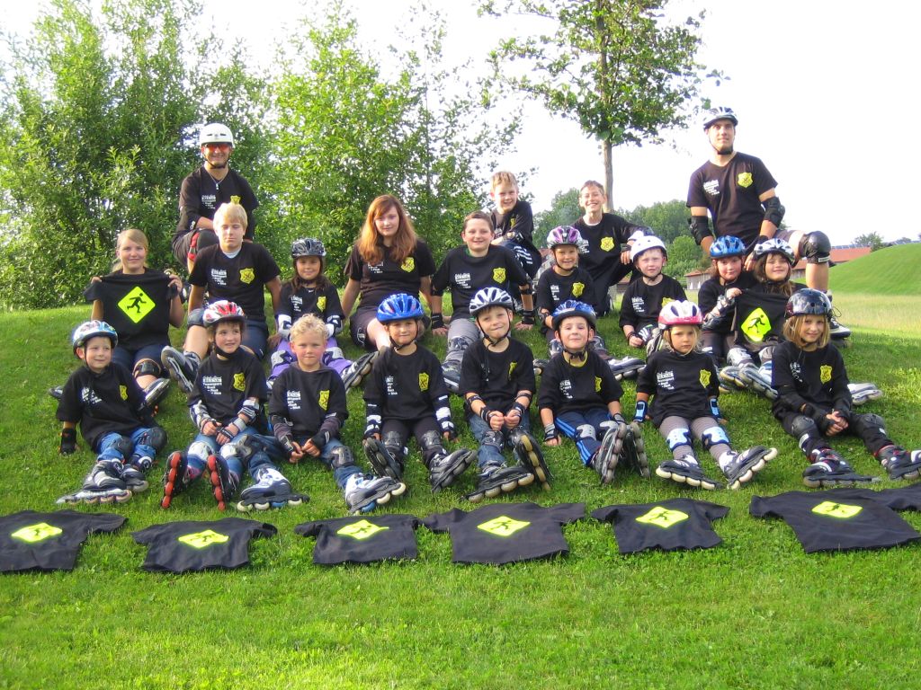 Der Inlinenachwuchs mit den neuen Action-T-Shirts des SC und den Übungleitern Horst Blöchl (hinten links) und Andy Weiherer (hinten rechts)